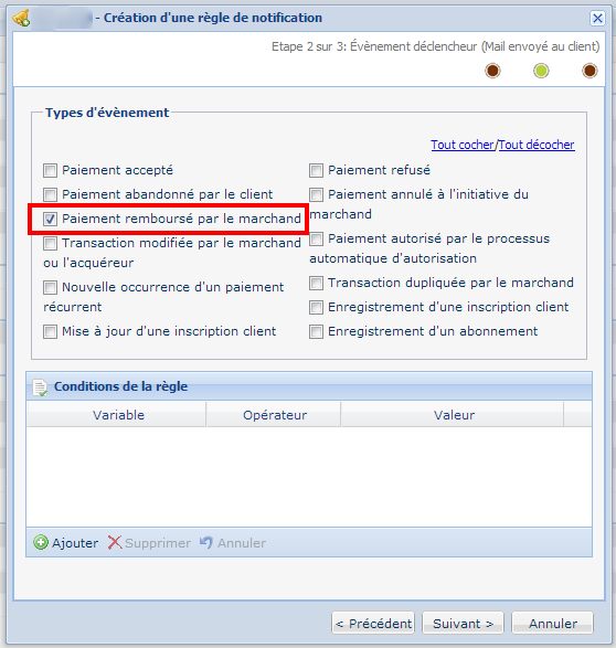 Une fois le type de règle définie, le marchand choisit le type d'événement: