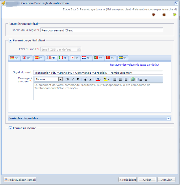 - Le texte du mail là encore en incluant des variables résolues par Payzen comme le montant du rembursement, le montant initial de la transaction, la devise, le numéro de commande, etc.