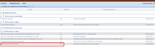 - l'envoi de mails (sur tout type d'événements: paiement accepté, paiement refusé, paiement annulé par le client, paiement annulé par le marchand, paiement remboursé, ..)