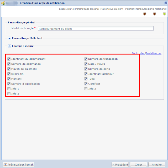 Le cadre matérialisé en rouge contient les champs qui seront présentés à l'acheteur dans le mail: